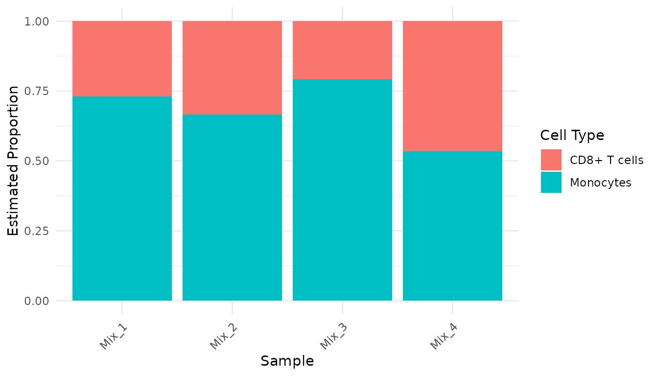 #> Mix_4 0.4650601 0.5349399The results show the estimated proportion of each cell type in each mixed sample.